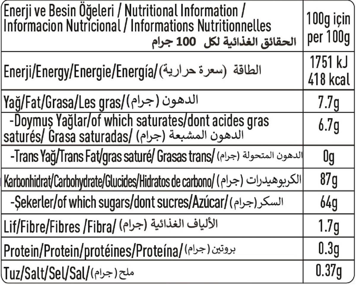 Tayaş Multi Fruit Poşet 350 Gr x 3 Adet Poşetin içeriğinde; Şeker, Glikoz Şurubu, Meyveli Dolgu %15 [Dekstroz, Şeker, Glikoz Şurubu, Meyve Konsantresi [Çilek(%3,5); Vişne, Elma (%10)], Kıvam Arttırıcı (Pektin E440), Asitlik Düzenleyiciler (Sitrik Asit E330, Trisodyum Sitrat E331), Aroma Vericiler (Çilek, Vişne, Tropikal (Ananas, Mango, Çarkıfelek Meyvesi), Şeftali, Kavun)], Peyniraltı Suyu Tozu, Tam Hidrojene Bitkisel Yağ (Palm Çekirdeği), Süt Kreması (%3,2), Asitlik Düzenleyici (Laktik Asit E270), Tereyağ, Tuz, Emülgatörler (Ayçiçek Lesitini E322, Yağ Asitlerinin Mono ve Digliseridleri E471), Aroma Vericiler (Çilek, Vişne, Tropikal (Ananas, Mango, Çarkıfelek Meyvesi), Şeftali, Kavun), Renklendiriciler (Antosiyanin E163, Beta Karoten E160a). Süt ürünleri içerir. İz miktarda fındık, yer fıstığı ve diğer yemişleri içerebilir. Isıdan, kokudan, nemden ve güneş ışığından uzak ortamda muhafaza ediniz. İçerir Meyveli Dolgu (%15) Çilek Konsantresi (%3.5) Vişne Konsantresi Elma Konsantresi (%10) Çilek Vişne Ananas Mango Çarkıfelek Meyvesi Şeftali Kavun